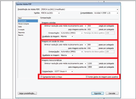 Neste janela, selecione a "Predefinição de Adobe PDF: [PDF-X1a:2001]"
