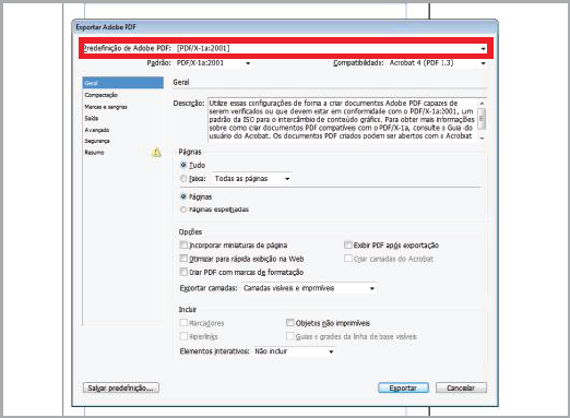 Neste janela, selecione a "Predefinição de Adobe PDF: [PDF-X1a:2001]"